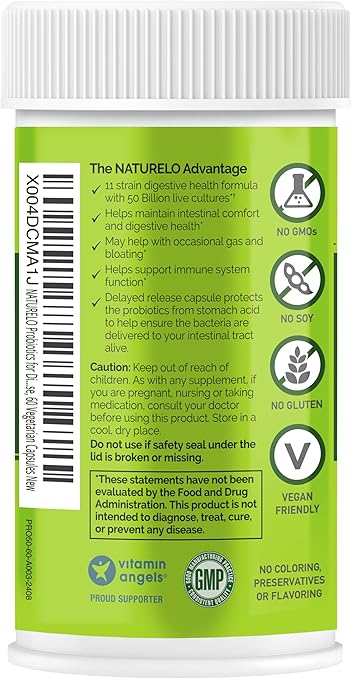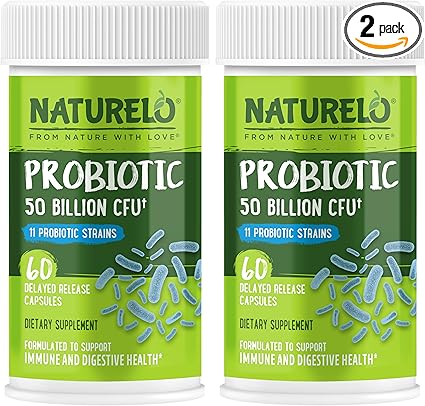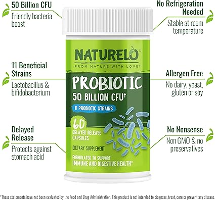 NATURELO’s Probiotics for Digestive Health offers a potent blend of 50 Billion CFU across 11 strains, providing comprehensive digestive support. The formula is shelf-stable and easy to incorporate into daily routines.