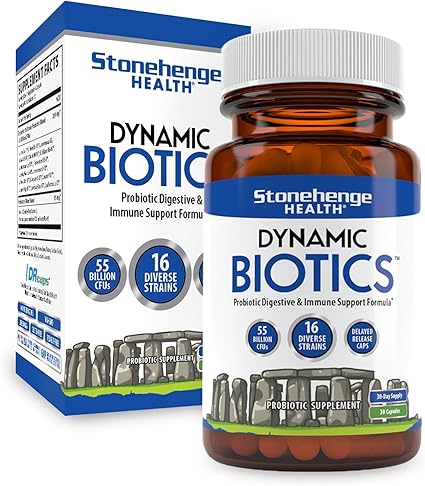 Stonehenge Health’s Probiotics offer a powerful blend of 55 Billion CFU across 16 strains, combined with prebiotics for enhanced gut health. The delayed-release capsules ensure optimal absorption.