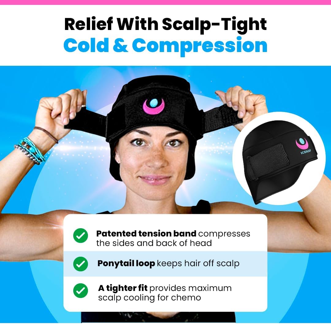 ICEKAP Cold Caps offer unique compression and long-lasting cold therapy, reducing scalp discomfort and helping with hair retention during chemotherapy.