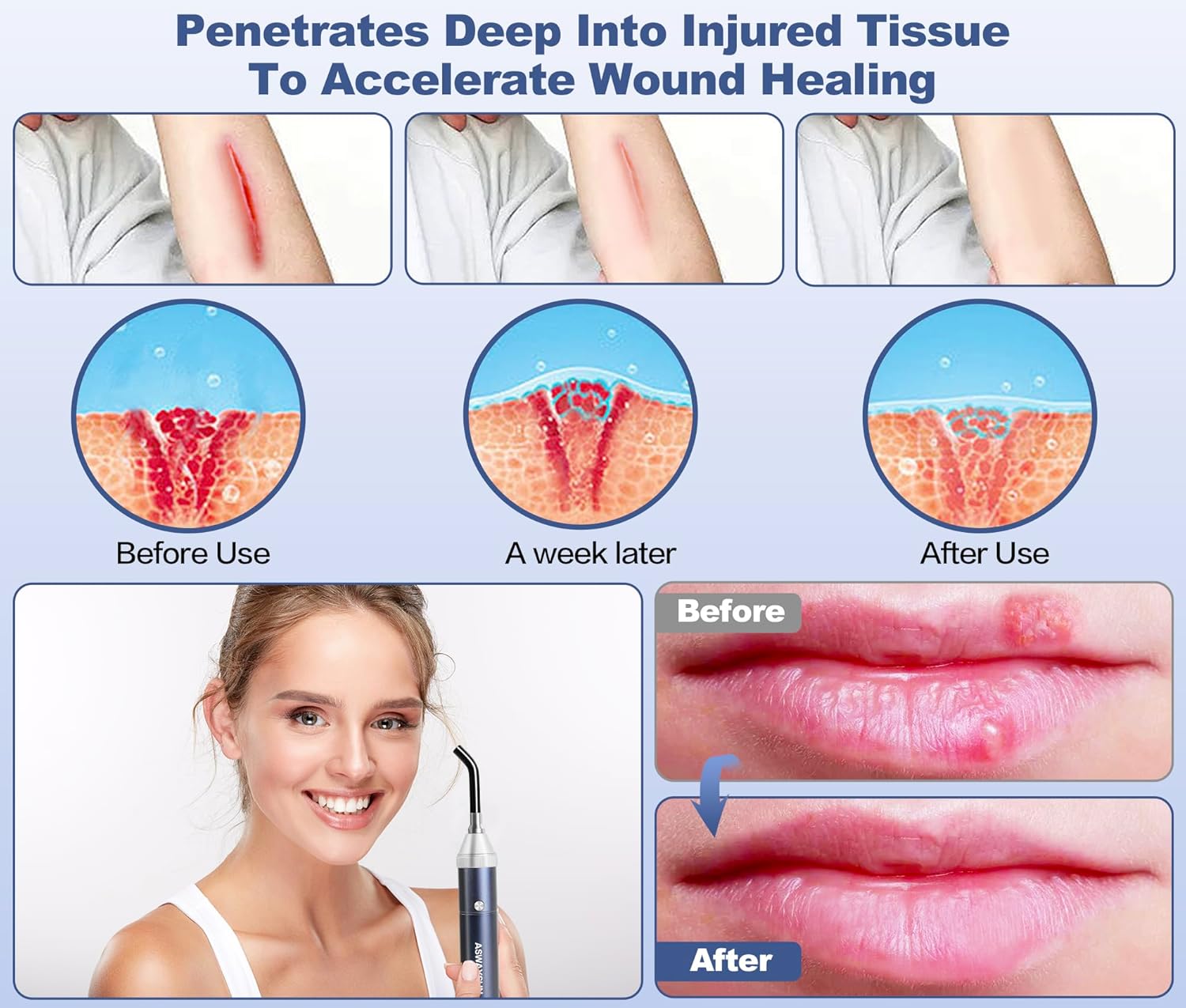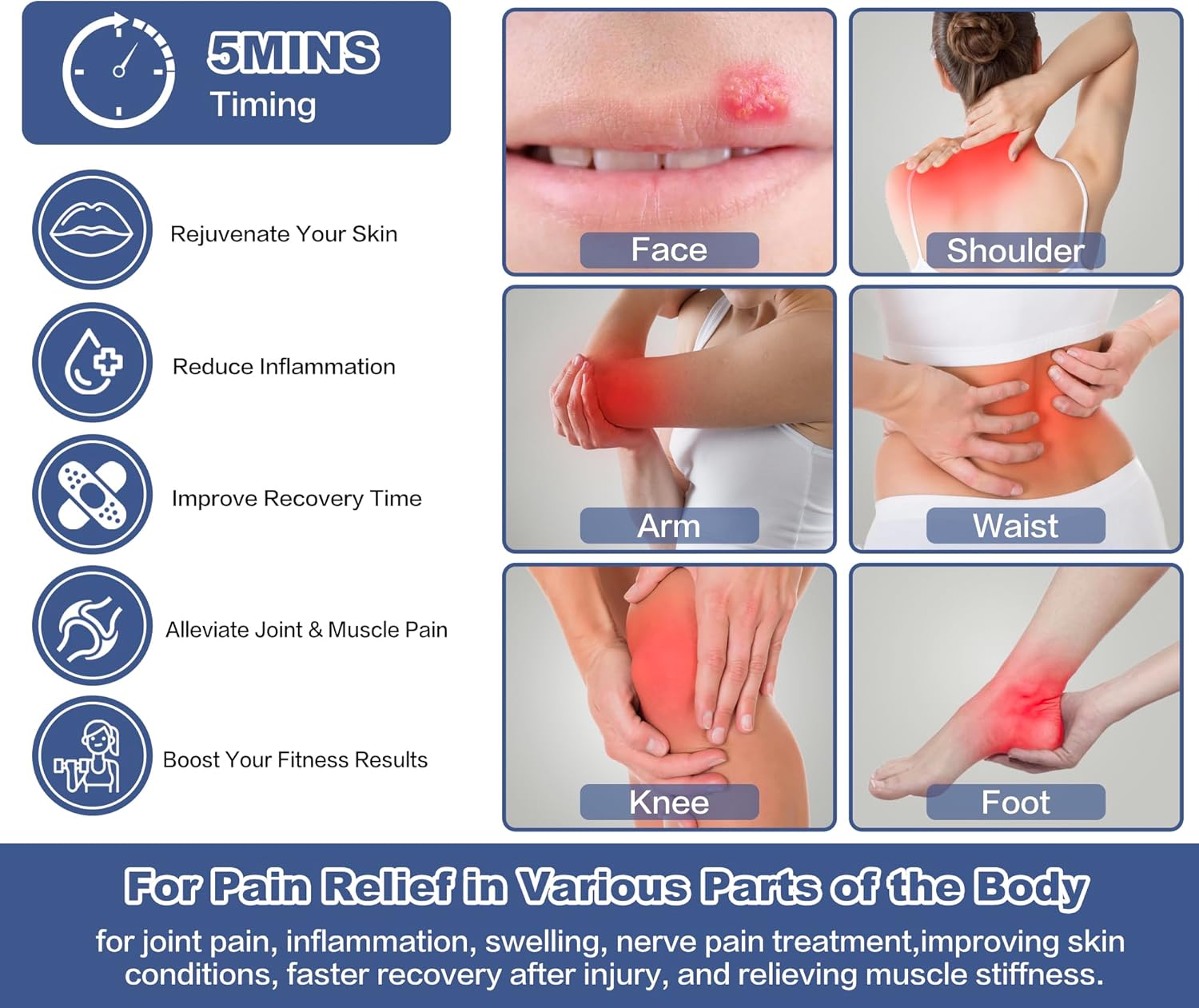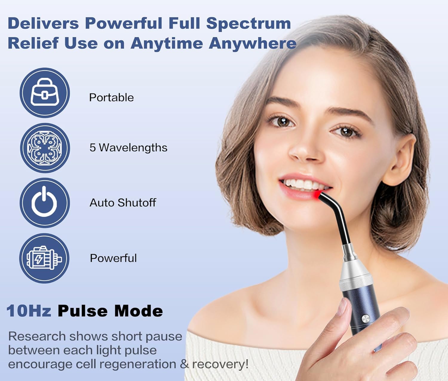 MOBOOMTIE’s Red Light Therapy Device provides non-invasive pain relief and promotes healing for cold and canker sores. Its versatile design allows for use on various body parts.