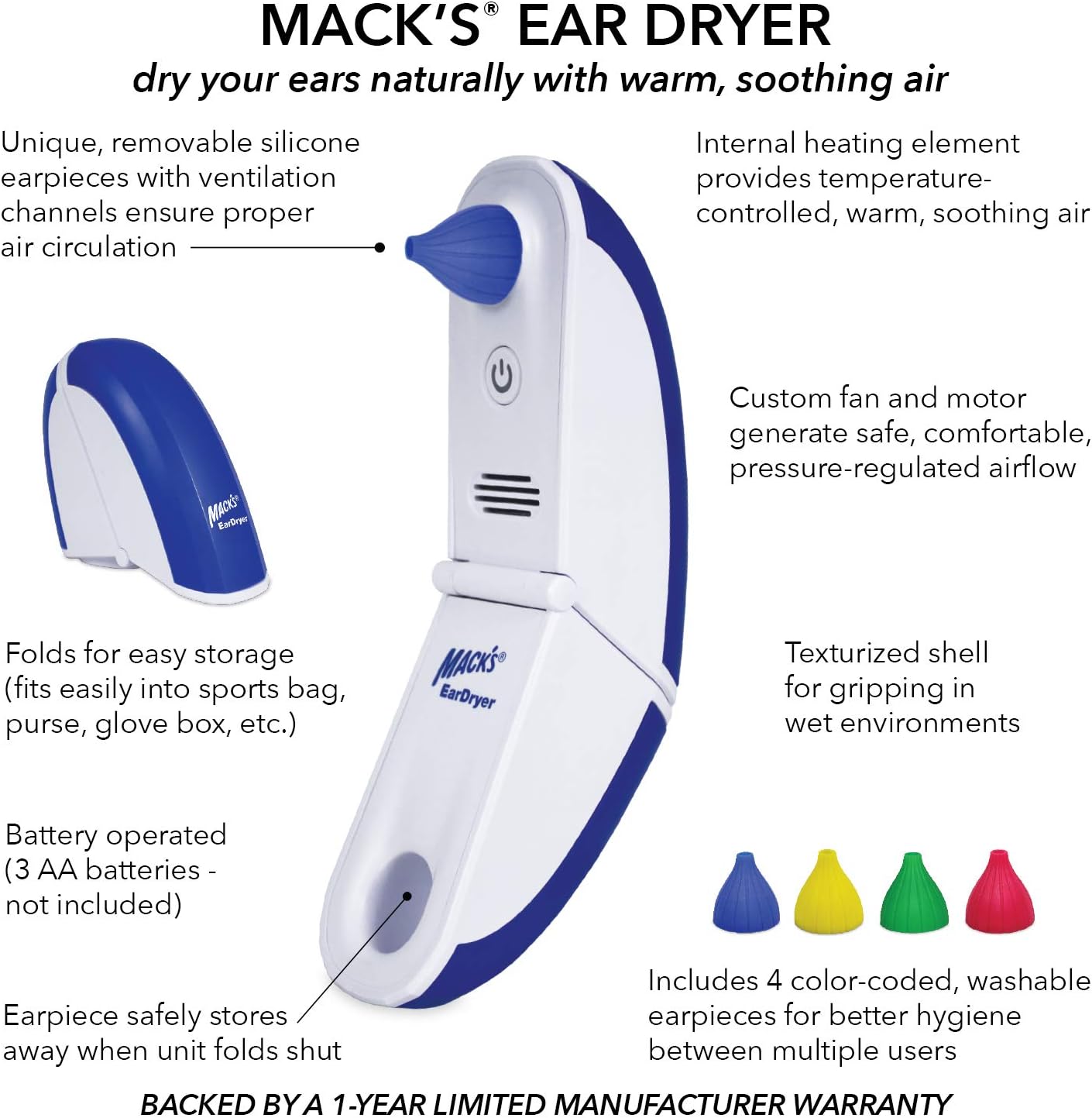 Mack’s Ear Dryer provides soothing electronic warm air to dry ears after water activities, preventing ear