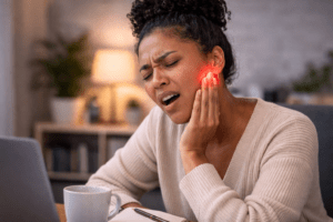 TMJ Disorder (Temporomandibular Joint Disorder) affects the joint that connects your jawbone to your skull, causing jaw pain, clicking sounds, headaches, earaches, or difficulty opening the mouth. It can result from stress, teeth grinding, jaw injury, or joint inflammation — often leading to chronic discomfort.