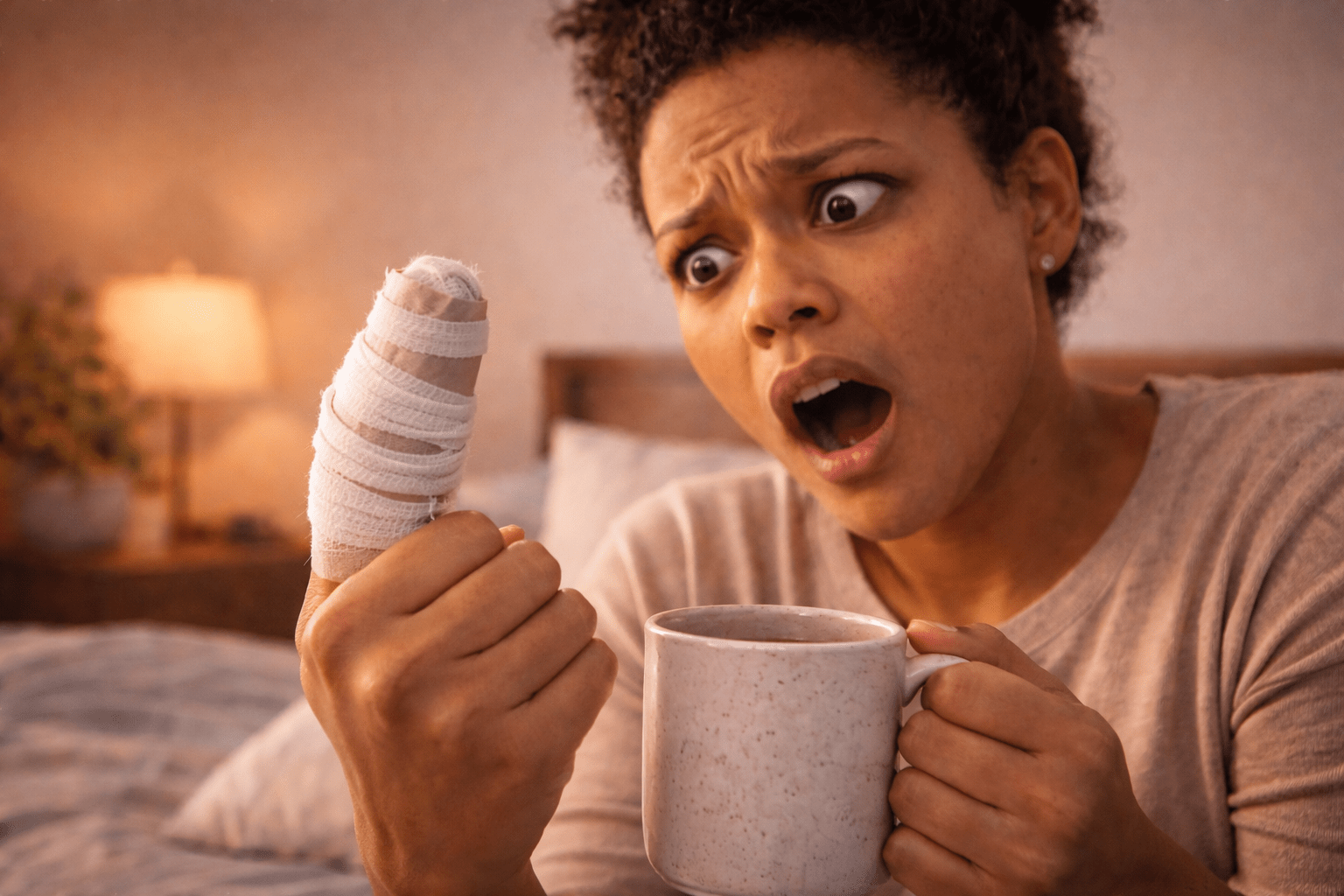 Suddenly you’re holding your coffee mug like it’s a fragile artifact from 1432 because one rebellious digit feels personally betrayed by life.