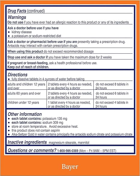 • Aspirin free: Contains anhydrous citric acid, potassium bicarbonate, and sodium bicarbonate. This product does not contain aspirin