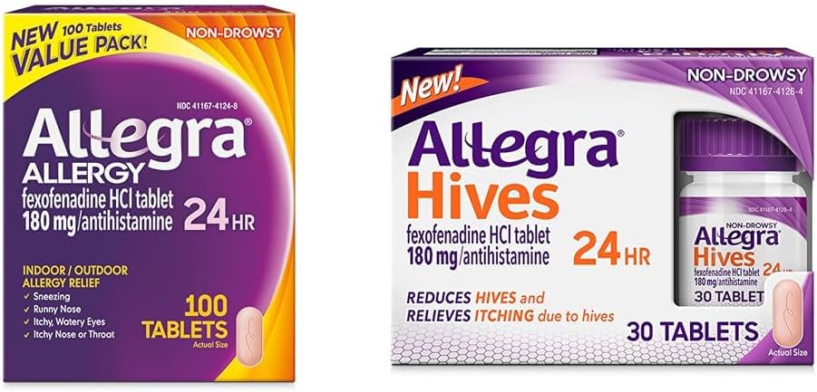 Find fast and long-lasting relief from allergies and hives with Allegra 24HR Adult Antihistamine Tablets. This convenient bundle includes a 100-count bottle for daily allergy management and a 30-count pack for on-the-go relief. Formulated with fexofenadine HCl, Allegra provides 24-hour, non-drowsy relief from common allergy symptoms such as sneezing, runny nose, itchy eyes, and hives, helping you stay active and comfortable throughout the day.