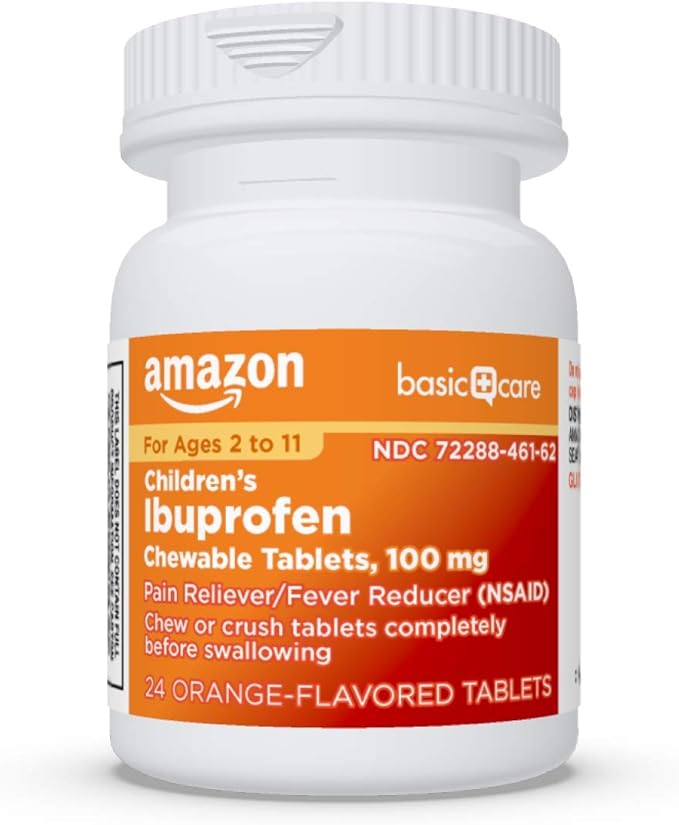 Amazon Basic Care Children’s Ibuprofen Chewable Tablets, 100 mg, Pain Reliever and Fever Reducer, Orange Flavor, For Aches, Pains, Sore Throat, Toothache and Headache Relief, 24 Count