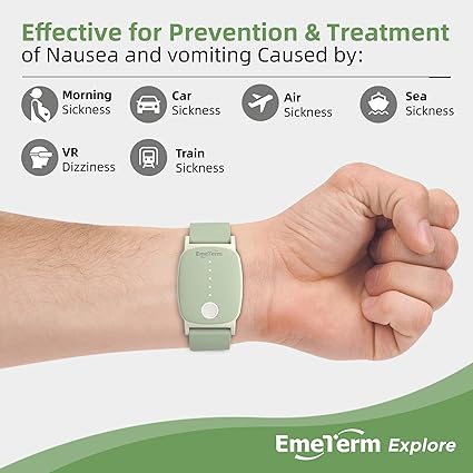 Drug-free, rechargeable wristband providing fast relief from morning sickness, motion sickness, and nausea. Uses neuromodulation technology with an IP67 waterproof design.