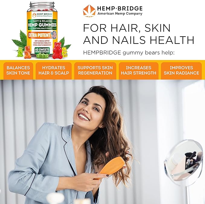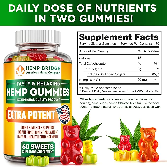 HEMPBRIDGE Hemp Gummies – Made in USA – Safe and Natural Omega 3 Supplement with Hemp Oil for Pain and Inflammation Relief – Max Value in Each Gummy – Vitamins B & E and Omega 3, 6, 9-60 Pcs