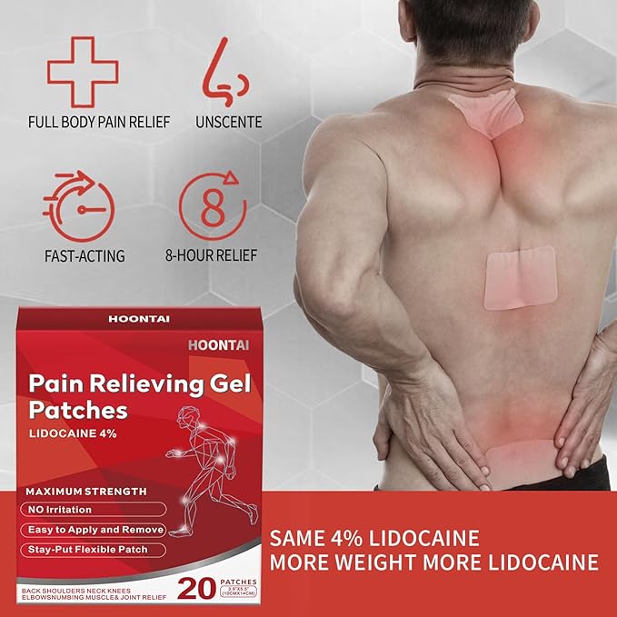 Get fast, targeted relief from pain with Lidocaine Patches, designed to deliver maximum strength pain relief for various parts of the body, including the back, neck, shoulders, knees, elbows, and more. These heat therapy patches provide long-lasting comfort and help alleviate soreness, stiffness, and discomfort from muscle aches, arthritis, or injuries. With 20 patches in each pack, you can experience soothing relief wherever and whenever you need it.