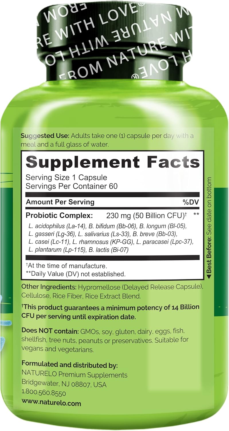 NATURELO Probiotics for Digestive Health – 50 Billion CFU, 11 Strains, Daily Supplement