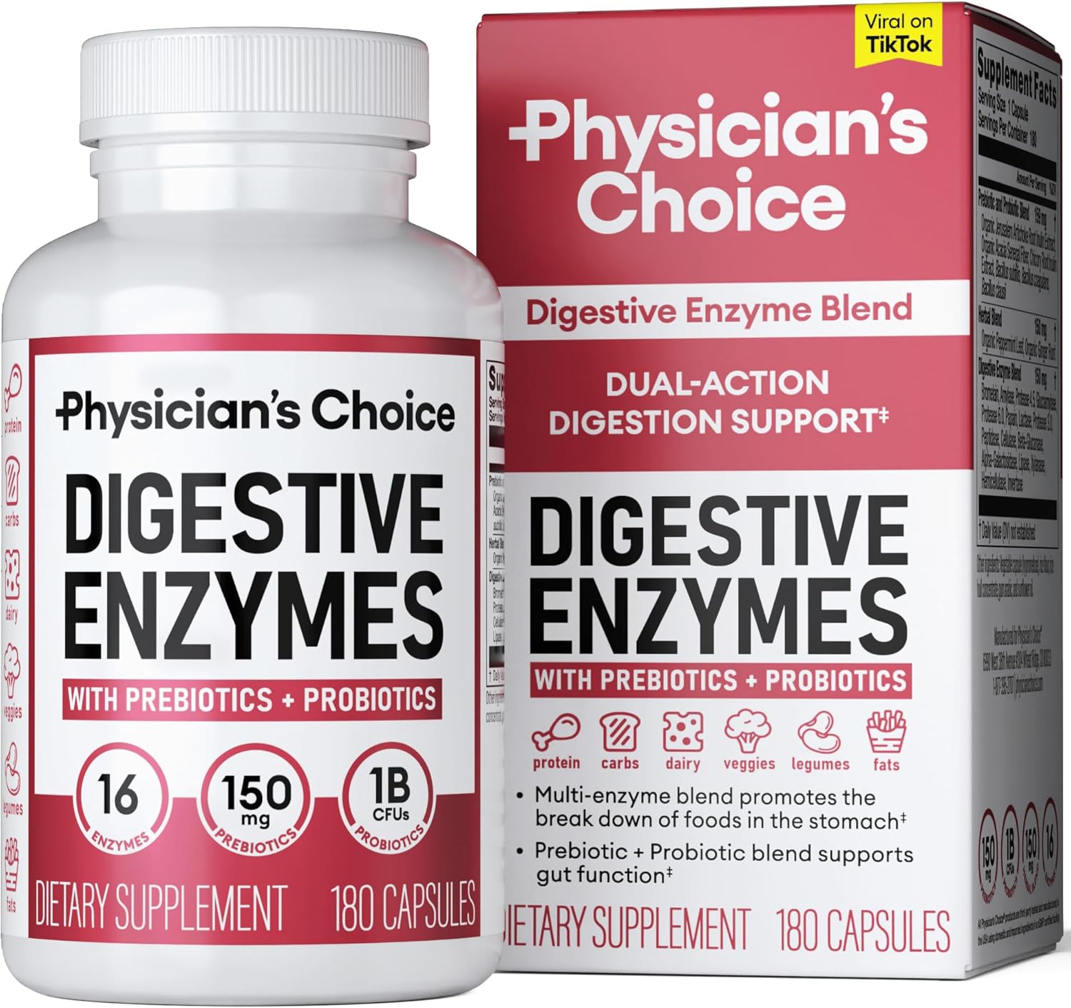 Physician’s CHOICE Digestive Enzymes is a comprehensive formula designed to support digestive health and provide relief from meal-time discomfort, bloating, and indigestion. Combining multi-enzymes, organic prebiotics, and probiotics, this dual-action approach promotes gut health, enhances digestion, and reduces digestive discomfort. With 180 capsules, this supplement offers long-lasting support for optimal digestion and nutrient absorption.