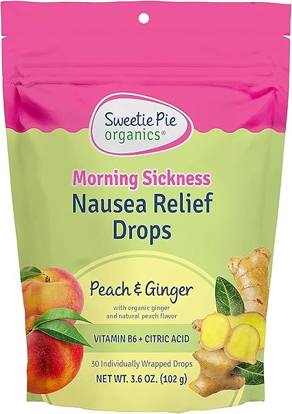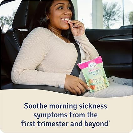 Peach and ginger-flavored drops to soothe first-trimester nausea naturally. Individually wrapped for easy use.