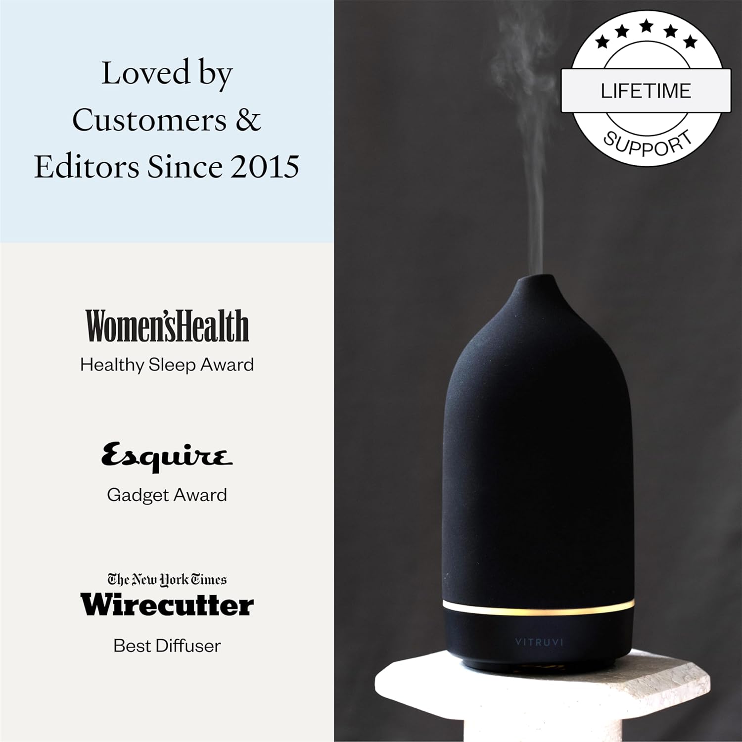 Vitruvi Stone Diffuser – Ceramic Ultrasonic Essential Oil Diffuser for Aromatherapy (Black, 90ml Capacity)