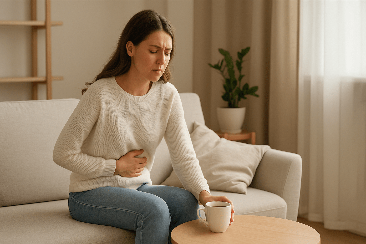 Feels like: Pressure or heaviness in the lower abdomen. Causes: Dehydration, low-fiber diet, or prolonged inactivity.